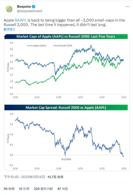 根據(jù)彭博社報(bào)道,蘋果公司的市值已超過羅素 2000 指數(shù)(Russell 2000)總和兩周時(shí)間,這是有記錄以來最長(zhǎng)的一次。
