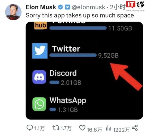 億萬富翁馬斯克今日在 Twitter 上分享了一張手機存儲空間的截圖,顯示 Twitter 應用占用了 9.52 GB,比大部分其他應用都多,他在推文中為此向用戶道歉。