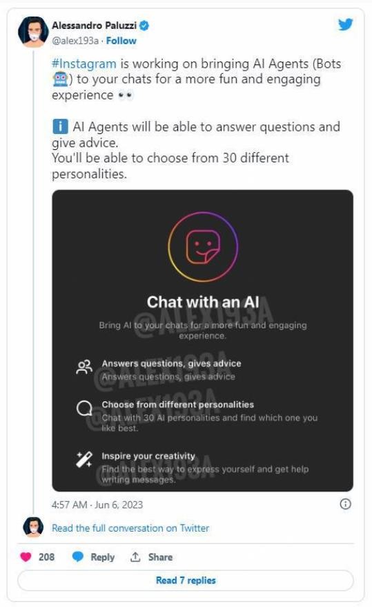 一條推文透露,Instagram 正在為其平臺測試人工智能聊天機器人。有了這項新功能,用戶將能夠與聊天機器人對話,在他們的直接消息中提出問題并獲得建議。