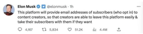 馬斯克今日發布推文,稱推特將向內容創作者提供訂閱者的電子郵件地址。馬斯克稱,此舉是為了讓創作者能夠輕松離開該平臺并在需要時帶走他們的訂閱者。