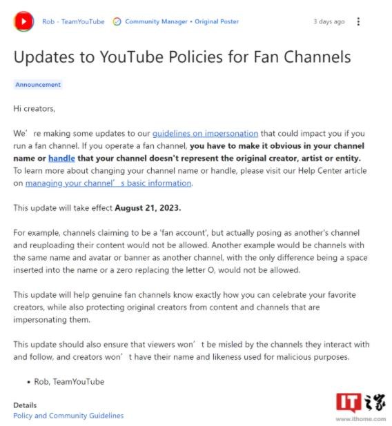 新規(guī)提出了多項(xiàng)新的禁止行為,違反這些政策可能會(huì)導(dǎo)致頻道或賬戶被暫停甚至永久凍結(jié)。對(duì)于運(yùn)營粉絲賬戶的頻道,官方明確要求需在頻道名稱或簡介中注明不代表原始創(chuàng)作者、藝術(shù)家或?qū)嶓w。