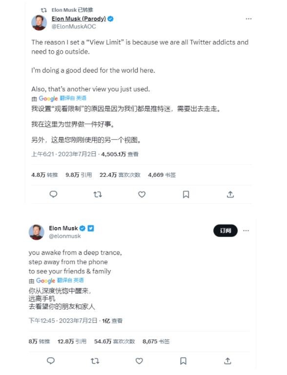 除了將限制第三方抓取推特數據作為對用戶進行瀏覽量限制的理由,推特老板馬斯克還發推文補充稱:“我設置推文瀏覽量的限制是因為我們都是‘推特成癮者’,每天大家都恍惚于網絡世界,(所以)我這是在為世界做一件好事,大家應該都離手機遠點,需要到外面去多進行社交活動,多去看看你的朋友和家人。”馬斯克在推文的最后還調侃:“你又用了一次瀏覽次數 "。