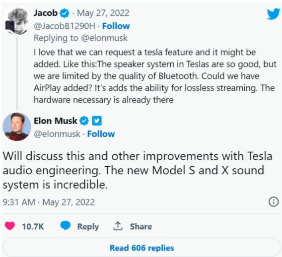 馬斯克在一年以前曾在推特上表示,特斯拉汽車未來將考慮增加蘋果隔空播放(AirPlay)支持,以提升 iPhone 無線播放音樂時的音頻質量,馬斯克當下兌現了他此前的承諾,特斯拉汽車有望在近期獲得 AirPlay 功能。