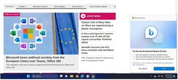 網友 Kevin Okemwa 近日打開谷歌 Chrome 瀏覽器之后,收到了“在 Chrome 中體驗全新 AI 驅動的必應”通知,點擊之后會打開新版必應頁面,并推薦用戶安裝和使用必應的擴展程序。