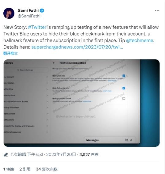 媒體今年 3 月報道,推特即將為 Twitter Blue 用戶推出個性化服務,允許隱藏藍 V 徽章。