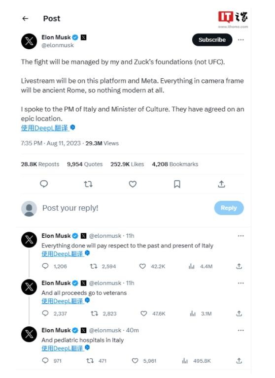 IT之家昨天曾報(bào)道馬斯克計(jì)劃將“馬扎籠斗”改成辯論賽的消息,可沒過多久,這位億萬富翁又聲稱這場戰(zhàn)斗仍將舉行,地點(diǎn)位于意大利的“一個(gè)史詩般的地方”。