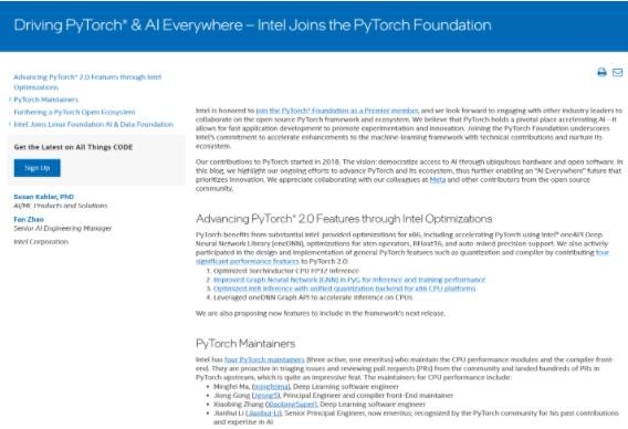 英特爾目前有四名 PyTorch 維護者,其中有三名活躍人員,一名退休人員,分別是 Mingfei Ma(深度學習與軟件工程師)、Jiong Gong(首席工程師和編譯器前端維護者)、Xiaobing Zhang(深度學習及軟件工程師)、Jianhui Li(高級首席工程師,現為名譽工程師,因其過去在人工智能方面的貢獻和專業知識而受到 PyTorch 社區的認可),他們負責維護 CPU 性能模塊和編譯器前端,目前已經為 PyTorch 上游合并了數百個 PR。