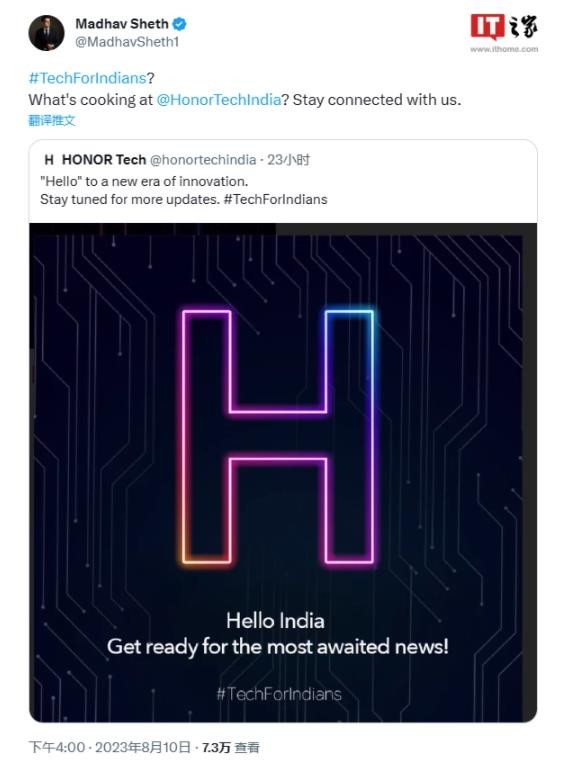 榮耀將久違地在印度發布新品手機,HONOR Tech 官方 X 賬號日前發布帖子,宣布將為印度市場帶來新消息。隨后 realme 印度前首席執行官 Madhav Sheth 轉發了這條帖子,確認將加盟榮耀。