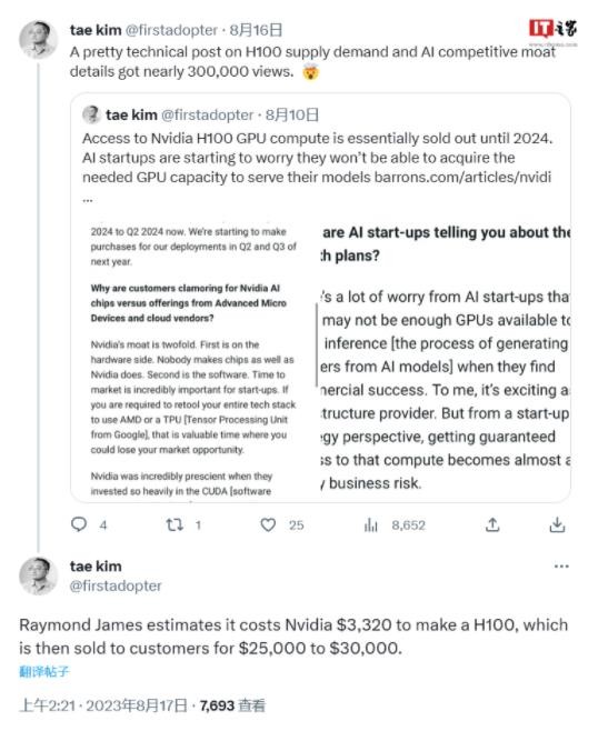 Tae Kim 表示,消息人士向投資銀行公司的 Raymond James 透露,H100 GPU 的成本為 3320 美元(IT之家備注:當前約 24236 元人民幣),而該公司以 25000 至 30000 美元(當前約 18.3 至 21.9 萬元人民幣)的價格出售這些 GPU。