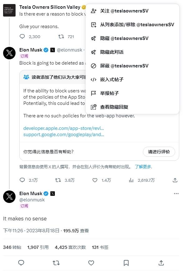 埃隆?馬斯克(Elon Musk)今天發(fā)布推文,表示未來將會(huì)刪除“屏蔽某人”功能,認(rèn)為其“毫無意義”。