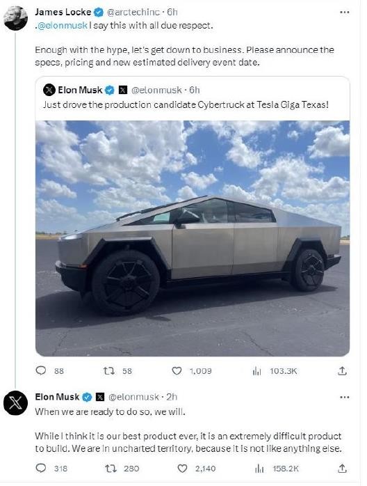 特斯拉 CEO 埃隆·馬斯克當?shù)貢r間周三發(fā)貼稱,他剛剛在特斯拉德州超級工廠試駕了一輛量產(chǎn)版 Cybertruck。一位X用戶評論稱:“我這么說完全是出于尊重。炒作夠了,我們開始談正事吧。請公布規(guī)格,價格和新的預計交付日期。”