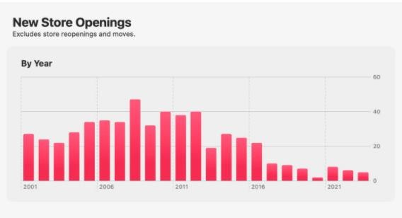 圖表顯示蘋果公司在 2012 年開設了 40 家新店,而在 2016 年縮短到 20 家,2017 年后這個數字進一步減少。