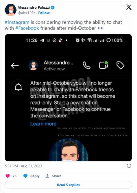 開發者 Alessandro Paluzzi 通過逆向編譯應用程序,暗示在今年 10 月開始,Meta 公司將會關閉 Facebook 和 Instagram 跨應用消息。