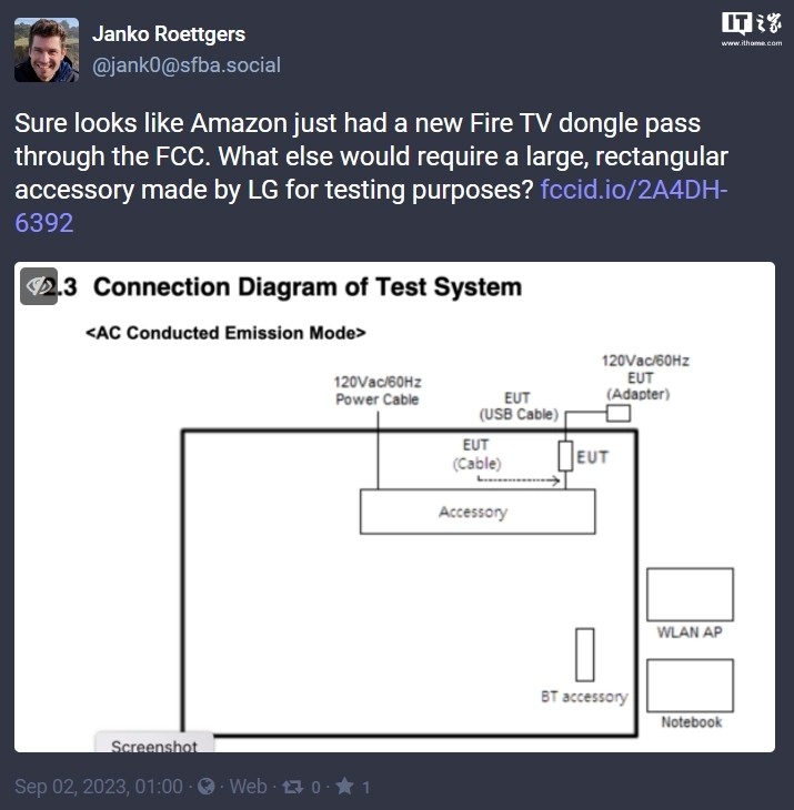 亞馬遜過去曾在 Fire TV 上使用過“數字媒體接收器”名稱,FCC 文件還列出了它們與 LG 在測試期間制造的大型“配件”連接的情況,該配件可能是 LG 電視或顯示器,并與藍牙配件一起使用。