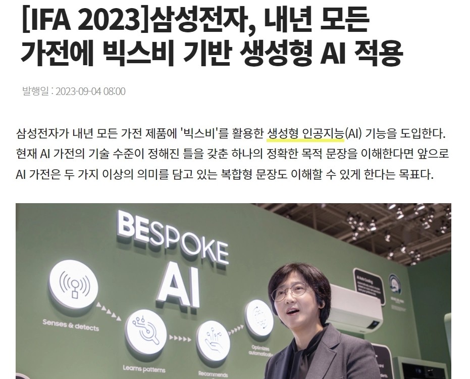 據(jù)韓媒 etnews 報(bào)道,三星電子家用電器部門副總裁 Miyoung Yu 在 IFA 2023 展會上宣布,三星電子明年將在所有家用電器中引入基于 Bixby 的生成式 AI 功能。