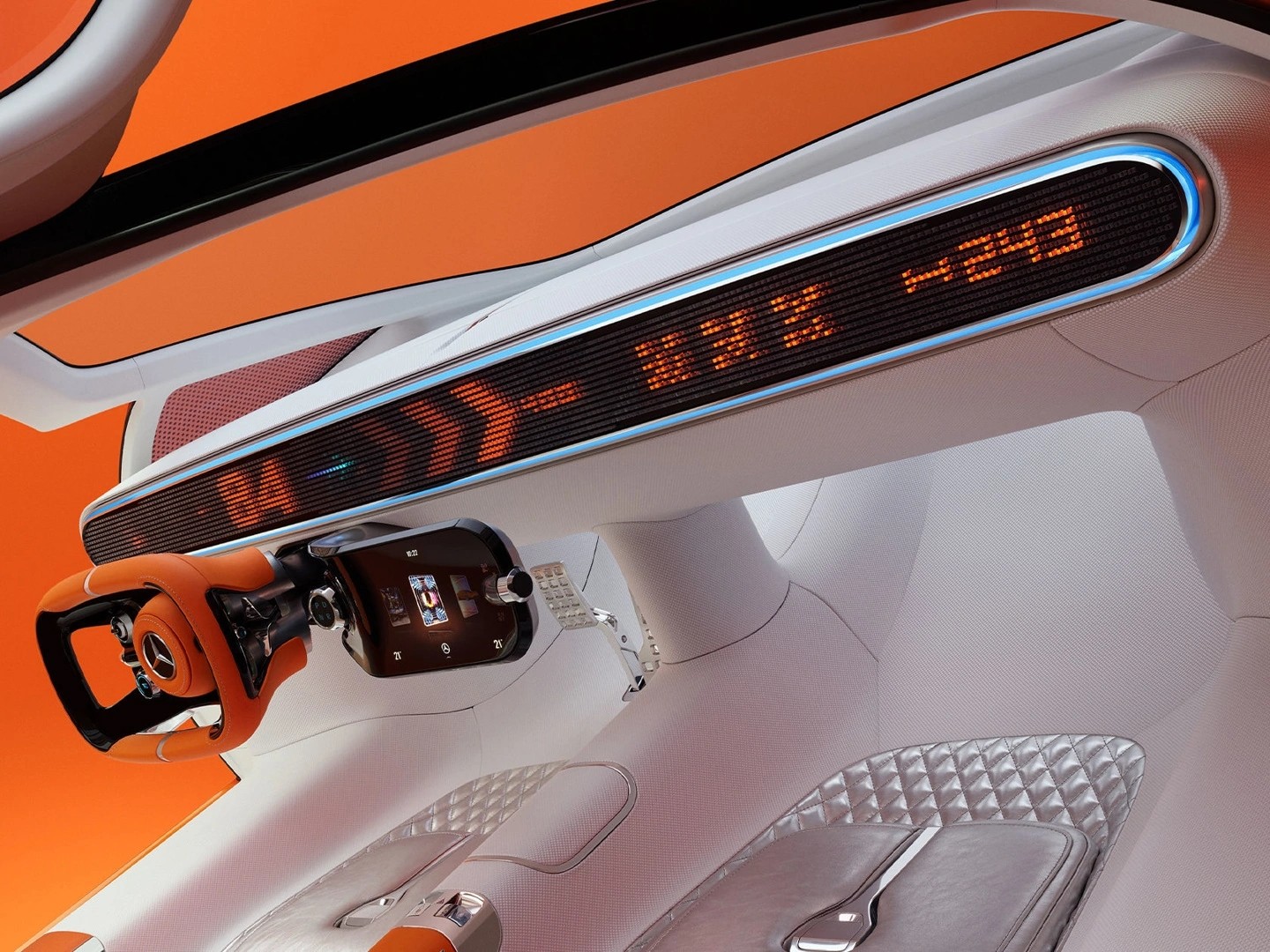其配備有一條細長的像素風車機屏幕,用以顯示車輛時速等核心信息,奔馳官方將這種設計稱之為“復古未來主義的 8-bit 像素風格”,奔馳還與 Magic Leap 進行合作,佩戴 Magic Leap 2 AR 眼鏡,還會在車內實時顯示 AR 地圖、可交互按鈕、虛擬儀表盤等內容。