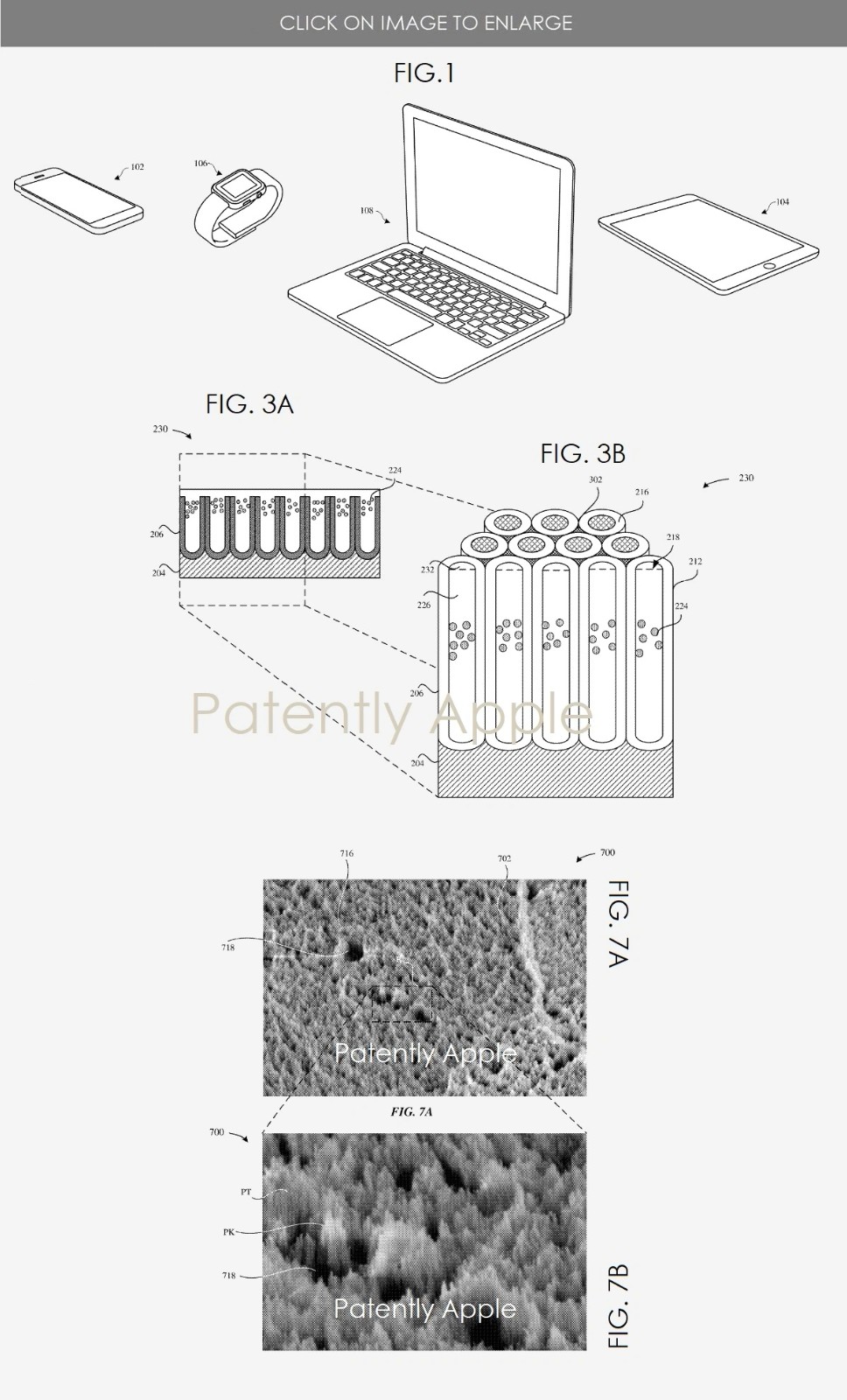 蘋果圖 1 部分展示了極端亞光黑的設(shè)備,包括 iPhone、Apple Watch、MacBook 和 iPad;而圖 3A 到 3B 展示經(jīng)歷蝕刻工藝之前的陽極化部件視圖;圖 7A 和 7B 展示具有光吸收特征的陽極化部件的示例性圖像。