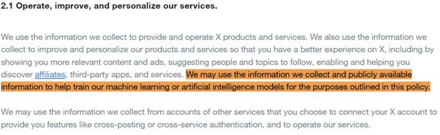 這兩天X(Twitter)更新了隱私政策,也明確說明了馬斯克要用 Twitter 數(shù)據(jù)訓(xùn)練模型:我們可以使用我們收集的信息以及公開可獲取的信息,來幫助訓(xùn)練我們的機(jī)器學(xué)習(xí)或人工智能模型,以達(dá)到本政策中列明的目的。
