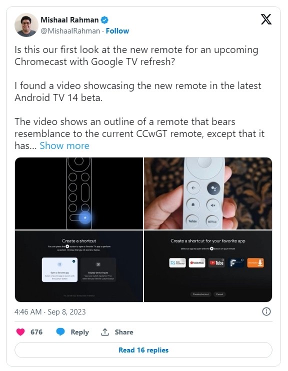 開發者 Mishaal Rahman 深入挖掘安卓 TV 14 Beta 代碼,暗示谷歌即將推出新款 Chromecast with Google TV 設備,并發現了相關的遙控器示意圖。