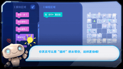 循環結構的編程知識同樣被隱藏在游戲互動中,讓青少年了解如何能提升效率。