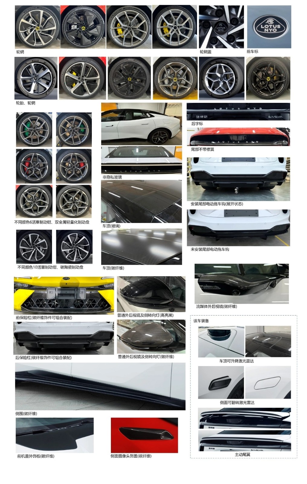 申報(bào)圖片顯示,路特斯 Emeya 純電超跑提供黑白兩種配色,車(chē)頂、流媒體外后視鏡、側(cè)圍、前機(jī)蓋外飾板、前后保險(xiǎn)杠等均提供碳纖維套件。此外,該車(chē)車(chē)頂配備可升降激光雷達(dá),側(cè)面配備可翻轉(zhuǎn)激光雷達(dá),車(chē)尾配備主動(dòng)尾翼。