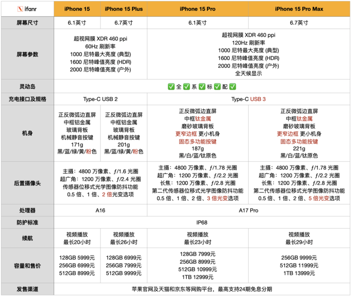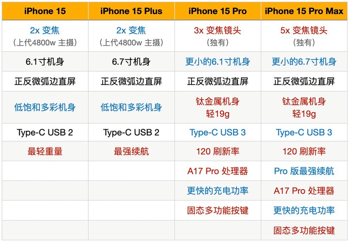 我們把每款 iPhone 15 最凸出的特點制表總結(jié),紅色代表強勢特點,藍色代表相對優(yōu)勢特點,一目了然。