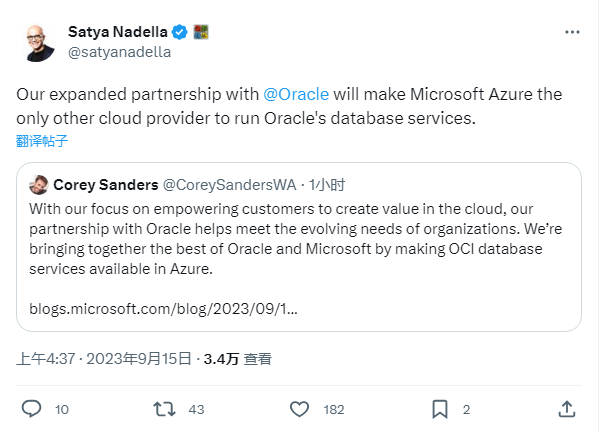 納德拉在隨后發布的推文中表示:“我們擴展了和甲骨文的合作關系,讓微軟 Azure 成為現有唯一能運行甲骨文數據庫服務的其它云提供商”。