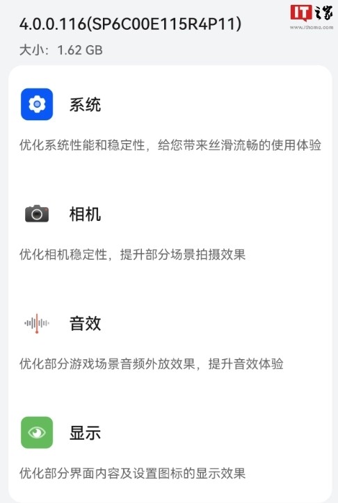 據(jù)網(wǎng)友反饋,華為 Mate 60 Pro 手機現(xiàn)已推送 HarmonyOS 4.0.0.116 版本更新,版本為SP6CO0E115R4P11,安裝包大小為 1.62GB。