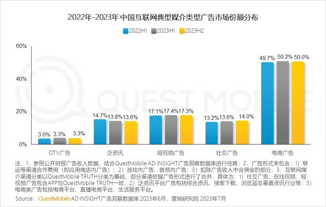 根據 QuestMobile 報告顯示,今年上半年,互聯網廣告的市場份額未有明顯變化,占比前三的依舊是電商廣告(50.0%)、短視頻廣告(17.3%)和泛資訊廣告(13.6%)。