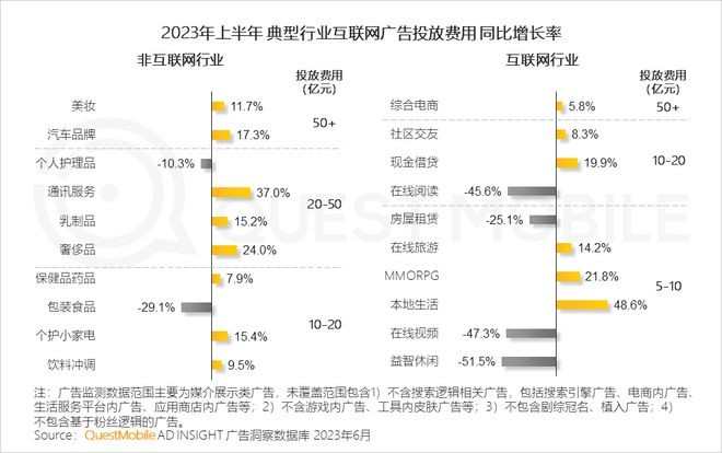 QuestMobile 數據顯示,2023 年上半年,本地生活賽道互聯網廣告投放費用同比增長 48.6%,排名最高,美團今年上半年的廣告收入增速排在第三位。