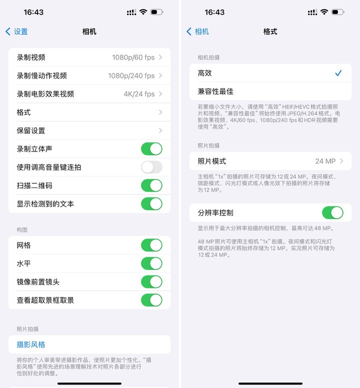 iPhone 默認(rèn)隱藏了這個(gè)選項(xiàng),需要在「設(shè)置-相機(jī)-格式-分辨率控制」中手動(dòng)開啟,之后在取景上方畫面中點(diǎn)擊 HEIF MAX 選項(xiàng)即可開啟 4800 萬(wàn)像素的最大分辨率,成像解析力提升非常明顯,很適合風(fēng)光攝影。