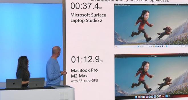 非常有趣的是,微軟也在現場拿著 Surface Laptop Studio 2 與搭載著 M2 Max 芯片的 MacBook Pro 進行渲染任務測試。在英偉達 GPU 的助力下,在這個項目上 Surface 呈現出了強一倍的表現。