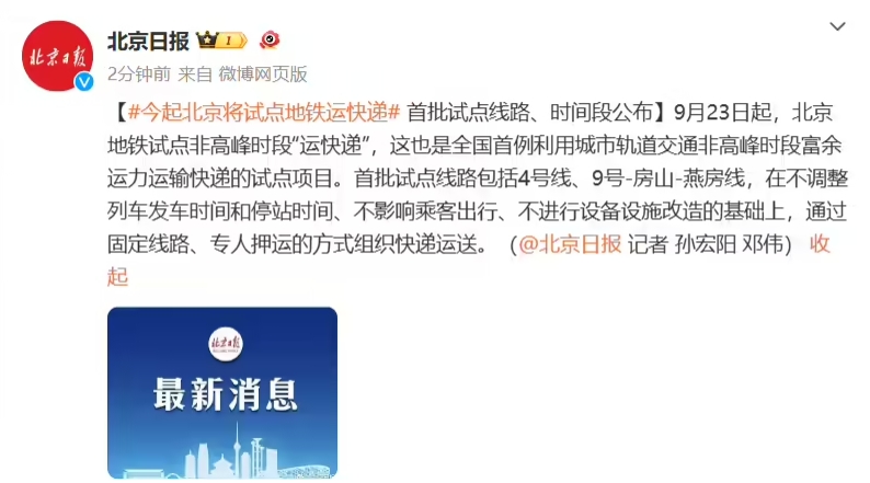 全國首例,北京地鐵今日起試點(diǎn)非高峰時(shí)段“運(yùn)快遞” 08:55:28