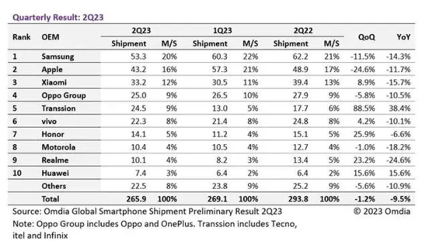根據(jù) Omdia 報告數(shù)據(jù),全球智能手機市場出貨量雖然還處于下滑趨勢,但整體來看 qoq
