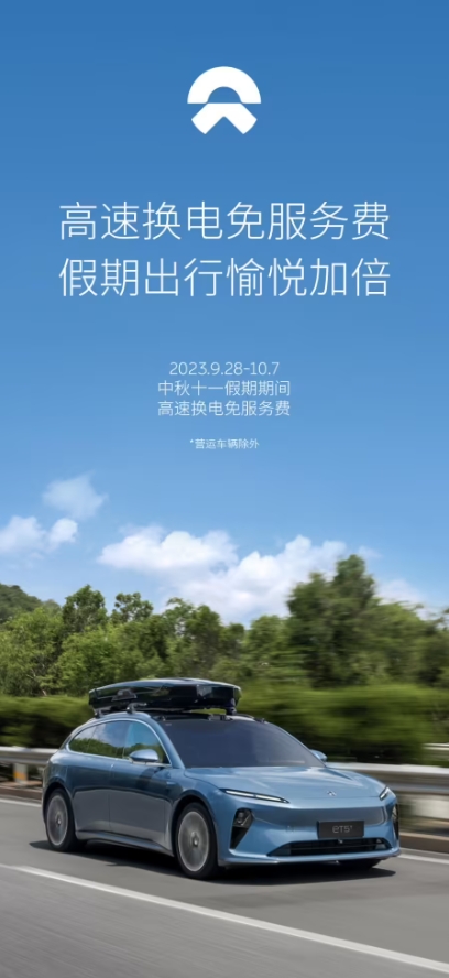 蔚來今日宣布,9 月 28 日至 10 月 7 日的假期期間將實行高速換電免服務費政策(營運車輛除外)。