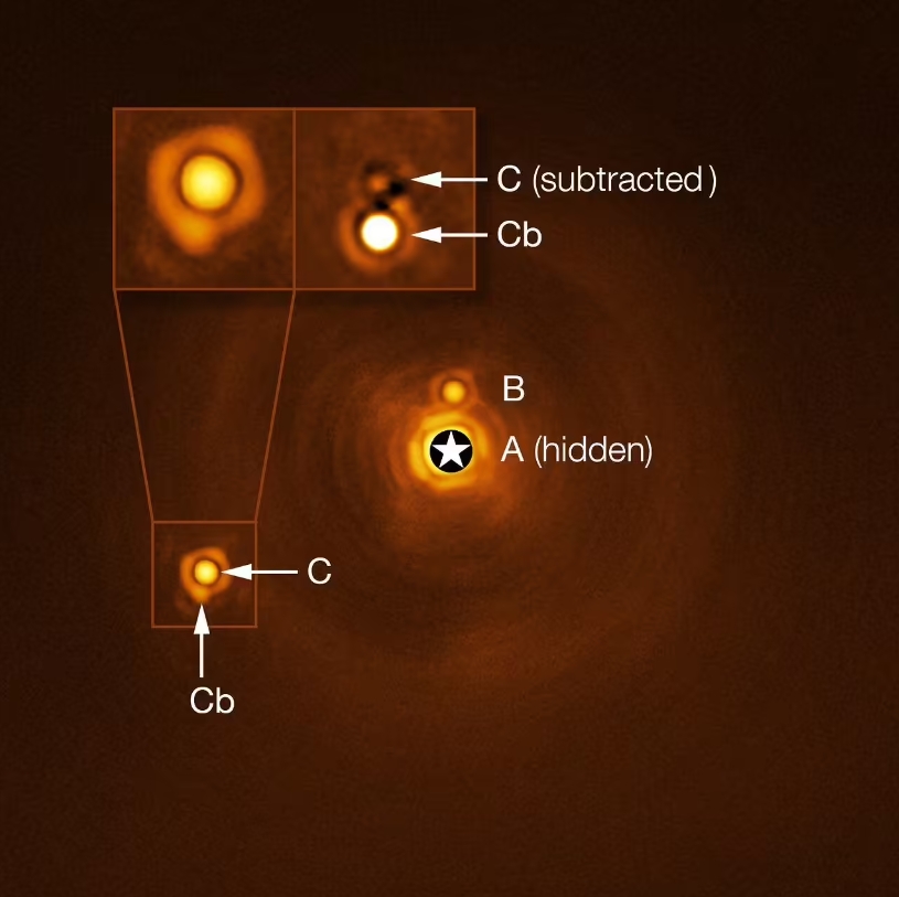 這項新的研究結果表明,該恒星系統(tǒng)中包含一顆圍繞恒星 C 運行的隱藏星 ——C b,屬于氣態(tài)巨行星,其質量大約是木星的 14.8 倍,繞恒星一周大約需要 285.2 年,距離恒星約 23.04 個天文單位。