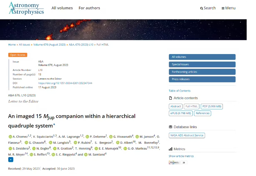 研究人員指出:“事實上,這是首個使用直接成像技術發(fā)現的分層四重系統(tǒng),這對于了解像這樣的復雜恒星系統(tǒng)是如何形成和演化的屬于是無價之寶。”