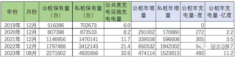 截止 2023 年 8 月,中國公樁保有量 227 萬部,私樁保有量 494 萬部。2023 年 1-8 月的公樁數量增長 47 萬個,隨車私樁較 2022 年底增長 152 萬個。公樁充電量 11 億度。平均公樁 1-8 月充電量 493 度,月均 62 度。