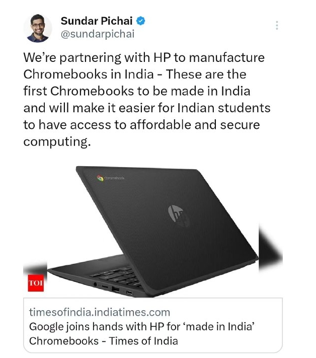 谷歌母公司Alphabet的首席執行官Sundar Pichai在原名為推特的社交媒體平臺X上發文稱,谷歌正與惠普合作以在印度生產Chromebook。