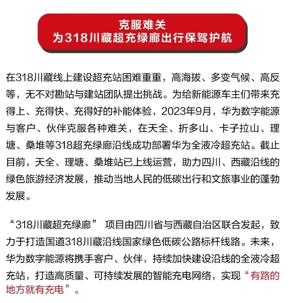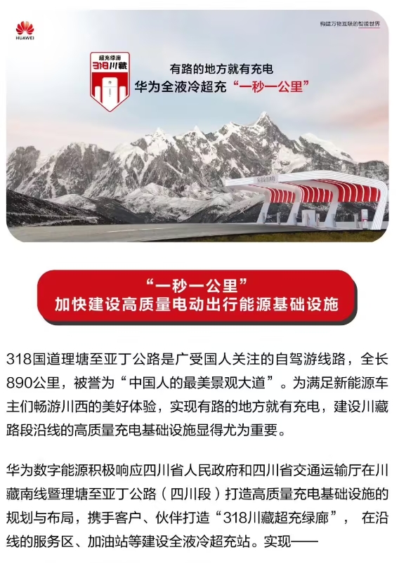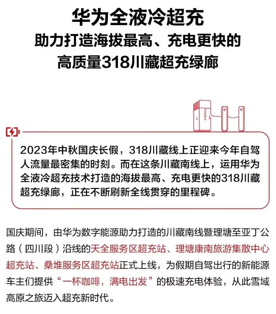 華為數字能源宣布,國慶假期期間,華為數字能源助力打造的全液冷超充站在川藏南線暨理塘、亞丁公路(四川段)沿線多地正式上線。