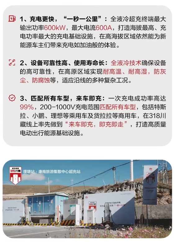 最大輸出功率 600kW,最大電流 600A,號稱“一秒一公里”,在海拔最高的區域可提供最大的充電功率。