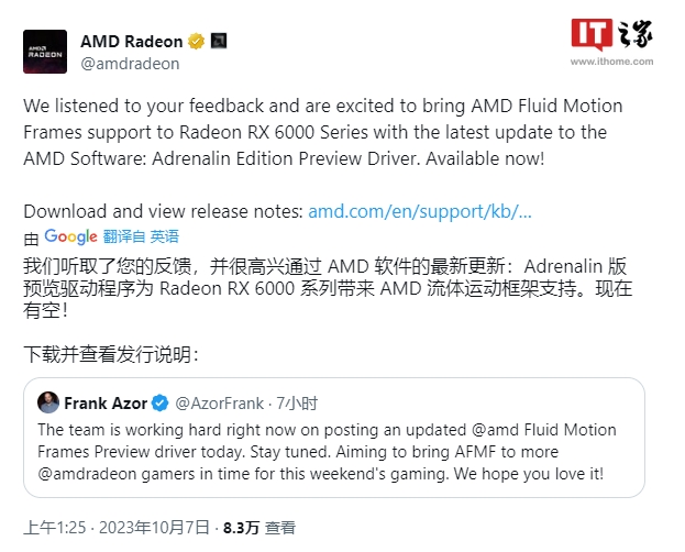 AMD 今日發(fā)布了一個新的 Adrenalin Edition 預(yù)覽驅(qū)動程序,為 RX 6000 系列顯卡啟用了 AMD Fluid Motion Frames(AFMF)幀生成技術(shù)支持,該技術(shù)最初僅支持 RX 7000 系列顯卡,但在舊款 AMD 顯卡用戶的強(qiáng)烈要求之后,該公司將 AFMF 向下兼容到了上一代顯卡。