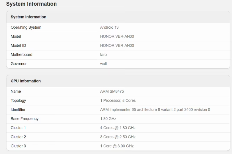 從該網站還可以看到,這款新機搭載驍龍 8 + 處理器降頻版,CPU 由 1 個 3.00 GHz 核心 + 3 個 2.50 GHz 核心 + 4 個 1.80 GHz 核心組成。作為對比,驍龍 8 + 處理器 CPU 由 1 個 3.2GHz 核心 + 3 個 2.75GHz 核心 + 4 個 2.0GHz 核心組成。
