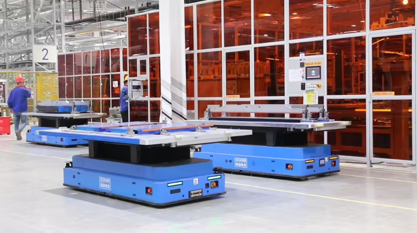 此外,車間內配備了 100 多臺 AGV 小車(注:Automated Guided Vehicle,自動導引運輸車)用來代替傳統輸送輥道,可節省約 30% 人力,生產設備也為迭代升級后的 2.0 版本。