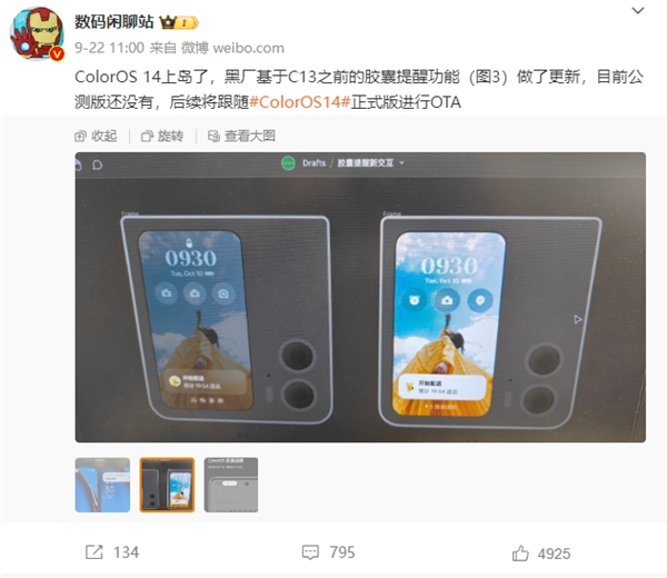 爆料稱,ColorOS 14的“類靈動島”功能是基于ColorOS 13之前的膠囊提醒功能進行更新,后者可以讓重要通知在狀態欄膠囊進行提醒。