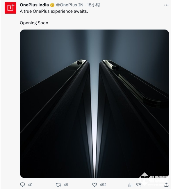 近日,一加India的官方賬號在社交媒體發文稱:“真正的一加體驗即將到來,敬請期待。”并附上了一張圖片,展示了新機將采用內折方案。這也意味著,一加的首款折疊屏手機將在印度市場發布。