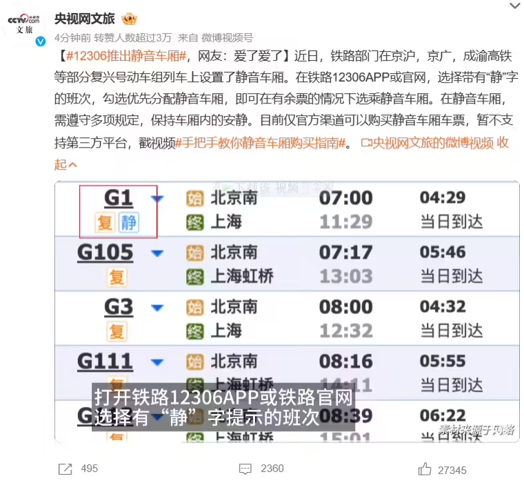今日早間,“12306 推出靜音車廂”登頂微博熱搜榜,鐵路部門在京滬,京廣,成渝高鐵等部分復興號動車組列車上設置了靜音車廂。
