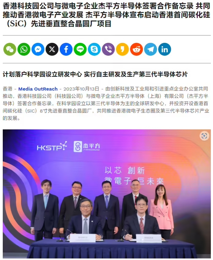 據(jù)中新社、香港科技園公司官方,香港科技園公司與微電子企業(yè)杰平方半導(dǎo)體有限公司簽署合作備忘錄,雙方將在香港科學(xué)園設(shè)立以第三代半導(dǎo)體為主的全球研發(fā)中心,并投資開設(shè)香港特別行政區(qū)首家碳化硅 8 寸先進(jìn)垂直整合晶圓廠。