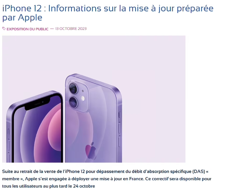 法國監管機構 ANFR 近日發布新聞稿,表示蘋果將于 10 月 24 日發布 iOS 17.1 穩定版,將修復 iPhone 12 的輻射問題。