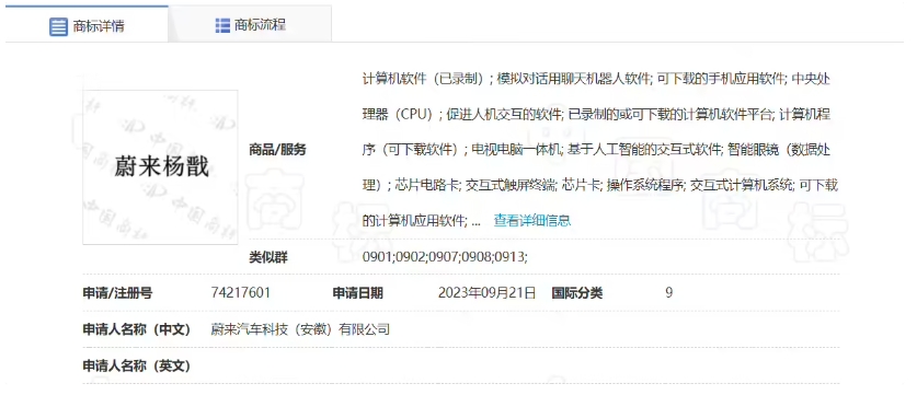 國家知識產權局商標局網站顯示,蔚來汽車科技(安徽)有限公司于 2023 年 9 月 21 日遞交了“蔚來楊戩”的注冊申請,國際分類為科學儀器,當前商標狀態為等待實質審查。